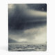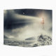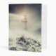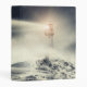 This photo features a lighthouse beacon shining with stormy weather and crashing waves.