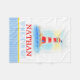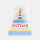 Cute lighthouse whimsical abstract kids art in blue, red, yellow, brown and white nautical blanket. Personalize with your name and message currently reads Kieron Dream big and shine bright. Original watercolor whimsical art and design by Sarah Trett www.mylittleeden.com