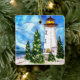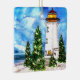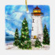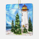 This charming ornament of Christmas by the Shore features a lighthouse, decorated trees on a snowy day. From an original alcoholink painting by Korinne Carpino.