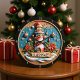This is a festive, circular-framed graphic design with a coastal Christmas theme. The central image features a red and white striped lighthouse wrapped in a decorative rope and topped with a red Santa hat. The lighthouse is set against a background of rustic blue and white wooden planks and is surrounded by festive decorations, including red poinsettia flowers, holly, red berries, and dangling snowflakes and ornaments. At the base of the lighthouse, a wooden sign with "WELCOME" is displayed. The entire scene is enclosed in a circular wooden frame, creating a cozy and welcoming holiday feel.