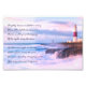 Beautiful red and white lighthouse on rocky coastline with waves crashing in white foam on rocky shore. A dusty blue and light lavender sunset hue landscape photography inspirational quote photo print featuring two verses of the uplifting familiar hymn "Let the Lower Lights be Burning".