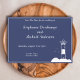 Elegant & simple navy blue Save The Date wedding invitation with an illustration of a lighthouse for a marine and nautical theme wedding! Just change the text and send it!