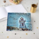 Lighthouse ocean nautical blue rustic wedding reception coastal vintage inspired guest book. Turquoise photo art of Killarney, Ontario Canada. Rocks in foreground, old red and white lighthouse against texture sky. Beautiful retro style design. Decorative seaside shoreline printed image. Look for matching products in my store collection. Image copyright Marg Seregelyi Photography.
