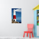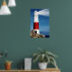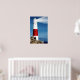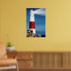 Lighthouse on rocks with light beams poster