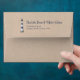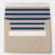 A nautical wedding invitation envelope featuring a one of a kind hand drawn lighthouse in a blue and white color theme on the back flap with a return address. The kraft background texture is an image and is optional. There are blue stripes in the inner lining. Text is blue in a modern and brush script font. Colors and fonts and are customizable.