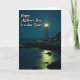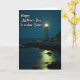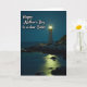This card shows a nighttime shoreline with a lone stone lighthouse rising from jagged, dark rocks, like a steady guardian watching over the water ❤️. A warm golden beam pours from the lantern room and stretches across the calm ocean, forming a soft, shimmering path that feels like a gentle hand reaching out to someone far away. The sea and sky sit in layered deep blues and teals, and the contrast makes the light look even more tender and inviting. Small tufts of hardy greenery cling to the cliffside and catch faint highlights along their edges, adding quiet texture to the scene. In the upper left, a flowing, elegant message reads “Happy Mother’s Day to a dear Sister,” set in light-colored lettering that stands out against the darker sky. The placement leaves the lighthouse unobstructed, so the words feel like a private note shared beside the glow, 🌼. The golden reflection ripples in thin, broken streaks across the water beneath the beam.