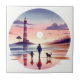 This tranquil coastal design captures a serene sunset moment where a parent, child, and dog stroll along reflective wet sand, framed by a glowing lighthouse in the distance. The circular composition and soft pastel tones evoke calm and nostalgia, while birds glide through a dreamy sky of lavender and coral hues. The symmetry of reflections enhances the peaceful ambiance, making it a perfect visual metaphor for cherished memories and quiet connection. Ideal for evoking feelings of warmth, family, and coastal escape, this scene blends painterly digital illustration with a minimalist, modern aesthetic. Display it as a daily reminder of life’s simple joys and nature’s gentle rhythms. AI generated artwork.
