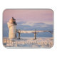 This amazing Getty Images photo features a winter scene showing an ice covered Lake Michigan lighthouse bathed in evening light and backed by pastel colored sky.