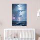 A dramatic digital painting depicts a stormy seascape with a powerful lightning bolt striking the ocean. The sky is dominated by dark, swirling clouds, with a hint of pink in the distance. The lightning bolt is a bright white, illuminating the clouds and the choppy waves below.