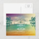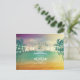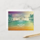 Gorgeous beach save the date postcards with modern script typography, seashell, starfish calligraphy and string of lights design. Nice sunset in the sea colors with ombre / gradient teal, purple, blue and yellow / orange. Perfect beach wedding save the date for destination wedding, beach wedding or coast wedding.