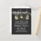 Rustic chalkboard background save the date postcard with grey hanging lights mason jars.
