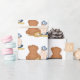 Cute baseball themed baby shower or first birthday gift wrap featuring a little baby boy in a baseball cap and a big teddy bear sitting on a baseball field.