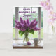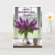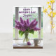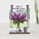 This card features a lush bouquet of violet blossoms ranging from soft lilac to deep magenta, gathered tightly in a clear glass vase on a sun-dappled wooden windowsill. A multi-paned window frames the scene, and the gentle daylight softens the edges, hinting at a fresh green view outside. The arrangement feels like a quiet shared moment, as if someone just set the flowers down with care and stayed close a little longer ❤️. In the upper area, a loving message from a daughter sits prominently in rich purple lettering, standing out against the light background. On the right side, a white crocheted doily adds cozy texture beside a simple white ceramic mug, suggesting an unhurried pause. A few fallen petals rest on the doily like small traces of affection, adding a tender, lived-in detail 🌼. The glass vase catches the light with subtle reflections, and the window’s grid lines sit softly behind the bouquet.