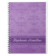 Lilac Damask notebook with an elegant damask pattern all over and a horizontal purple stripe near the bottom to write your name.