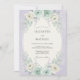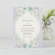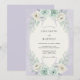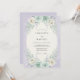 This design features a soft lavender background with a beautiful arrangement of watercolor flora. Delicate mint green roses and cream blossoms are nestled among silvery eucalyptus leaves and sprigs of lavender. The ethereal color palette of pastel purple, teal, and white creates a romantic and serene atmosphere for a spring event.