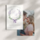 An elegant wedding save the date announcement featuring a watercolor lavender flowers and leaves horseshoe wreath finished off with pretty coquette bow. Your monogram is in lilac traditional script font and wedding date in serif grey in the centre. Personalize further with your names, wedding location and photo on the reverse.