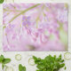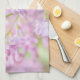 Macro photo of a tender lilac flowers of pink and purple colors against light green background. Textured photography. Happy spring season. Kitchen towel.