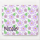 A mouse pad built with a lilac flower pattern. Customize it with your own text, background color, among other options.