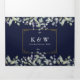 All in one navy blue tri-fold wedding invitation featuring sage and lilac greenery, elegant typography and your special photo. The invitation includes your celebration guest information details and a detachable RSVP card. Designed by Thisisnotme©