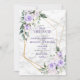 Modern and trendy, this pretty wedding Save the Date card design features a faux gold geometric embellished with lilac lavender purple florals, dusty blue green watercolor greenery, and features trend hand lettering. Part of a matching wedding suite. Copyright Elegant Invites, all rights reserved.