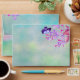 Lilac, purple, forget-me-not or lavender flower designs with burgundy leaves, pink buds on a softly textured mix turquoise background