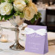 This lovely lilac wedding favor box features beautiful white typography and a white bowon a soft purple background for a spring ceremony in the afternoon. Lavender pastel favor boxes in a delicate color choice for an elegant garden occasion.