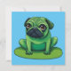 Cute green Pug resembling a frog sitting on a lilipad. Background colour can be changed.