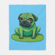 Cute green Pug resembling a frog sitting on a lilipad. Background colour can be changed.