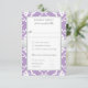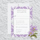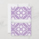 This wedding response card features a lavender damask floral pattern with a white lily motif inspired by the Art Nouveau era, symbolizing love and romance. A silver ribbon adds an elegant romantic touch and includes a meal selection option for the reception.