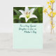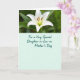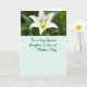 This greeting card features a graceful white lily filling the upper half, its six soft petals opening in even symmetry against a blurred wash of leafy greens. Gentle light catches the flower’s smooth edges and draws your eye to the center, where slim golden-brown tips add a warm touch. The calm, nature-focused layout sets a tender, caring mood, like a quiet moment shared with someone close ❤️. Below the flower, a wide panel of muted light teal-green creates open space for the message. The text, “For a Very Special Daughter-in-Law on Mother’s Day,” sits centered in the lower section in dark emerald lettering, standing out clearly against the pale background. A small 🌼 detail can be imagined in the way the greens and whites balance, keeping the look soft and affectionate without feeling busy. The top half is photo-like with crisp floral detail, while the bottom half stays smooth and uncluttered with the dark emerald line of text centered on the teal-green field.