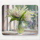 Lily of the Valley bouquet by a sunlit window on an old wooden table.