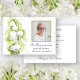 Invite guests to remember your loved-one one year after their passing with the elegant Lily of the Valley Flowers Death Anniversary Invitation. This pretty custom flowery celebration of life memorial tribute invite features a close up digitally painted floral photograph of white Lily of the Valley flowers on the stem with a blurred green garden background. Personalize it with the name, birth and death dates and photo of the deceased. Available as a printed invitation for mailing and/or as a digital download for easy sharing digitally online.