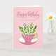 A quaint little pink tea cup filled with a beautiful bunch of lily of the valley flowers along with the hand lettered words Happy Birthday on the top of card and the hand lettered words 55 today with love hearts on the tea cup. A sweet birthday card for your aunt turning 55 today!