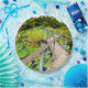 Lily pond with a wooden boardwalk snaking over the water