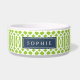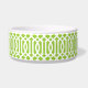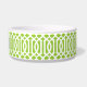 Cute customized cat or dog food bowl with a lime green imperial trellis pattern and rectangle frame placeholder for your beloved pet's name.