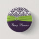 This purple and white damask with faux lime green ribbon and jewels Ring Bearer button matches the wedding invitation show below. The text is customizable and so is the shape and size of the button. If you need anything changed, please email niteowlstudio@gmail.com.
