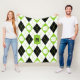 This colorful basketball team colors fleece blanket features a lime green, black and white argyle plaid pattern with lime "stitching" extending diagonally across the diamond shapes and semitransparent basketballs that overlie and blend with the lime diamond shapes - customize with athlete's monogram - by katz_d_zynes