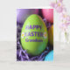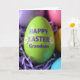 This card features a close-up of a glossy, egg-shaped decoration in bright lime green, filling most of the view like a sweet little gift meant for someone special 🐰. Raised purple letters sit across the front of the egg, with a cheerful seasonal greeting and a friendly “to” name placed prominently in the center. Two small white flowers with sunny yellow centers sit near the wording, like tiny accents that echo a gentle, caring touch between close friends. The egg rests in a nest of finely shredded, crinkled filler in deep lavender, adding soft texture around the smooth surface. The lighting is even and gentle, bringing out the egg’s shine and the curls of the lavender strands without harsh shadows. In the blurred background, other egg shapes appear as soft patches of lilac, pink, pale yellow, and light blue, creating a calm, cozy scene that feels like it’s been set up for sharing 🌷. The purple text looks slightly raised against the green surface, with the white flowers placed as small markers around the message. The foreground egg is sharply focused while the pastel eggs behind it fade into a smooth blur over the lavender bedding.