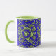 11 oz. Coffee Mug in Flower Medallion motif. Vivid blue background with lime green and black stylized flower design. Lime green handle and interior.