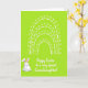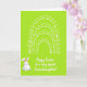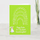 This card features a bright lime-green background that brings to mind fresh spring mornings, with a friendly, lighthearted mood. Near the top, a white arched motif is made from several parallel, broken bands, each dotted with small round circles like beads on a garland. The simple pattern feels like it’s hovering above the scene, adding a gentle sense of celebration without crowding the space. In the lower left, a round white bunny 🐰 stands with upright ears tinted soft pink, rosy cheeks, and tiny dark eyes that seem to glance toward the opposite corner in a sweet, companionable way. Its small smile and relaxed posture suggest it’s waiting for someone to join in, like a quiet nod of friendship. In the lower right, a short Easter greeting appears in flowing cursive-style lettering, set in white to stand out clearly against the green. A few small circles within the top arch echo the bunny’s cheeks, and a little 🌷 touch of spring is suggested by the airy spacing and open background around the design.