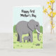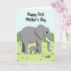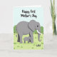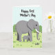 Designed with two stylized elephants at the center, this illustration shows a larger adult standing close beside a smaller youngster, their bodies angled together in a protective, affectionate pose ❤️. Both are shaded in soft greys with gentle depth, and the adult’s curved white tusks and calm, watchful eye give the scene a caring, steady feel. The baby mirrors the adult with tiny tusks and a slightly upturned gaze, creating a sweet, close-knit connection that reads like family and friendship at once. They stand on a bright lime-green ground with simple leaf shapes and rounded plant forms scattered around, set beneath a pale blue sky. Near the top, the main message “Happy first Mother’s Day” is placed prominently in a flowing, decorative lettering style, rendered in a dark tone that stands out clearly. Near the bottom, the smaller word “Wife!” appears as a short secondary line in a matching dark color, tucked neatly above the grass line 🌼. Across the foreground, several “W”-shaped grass strokes repeat in green, adding a patterned texture along the base of the scene.