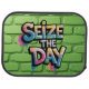 A graffiti-style text design reading "SEIZE THE DAY" on a lime green brick wall background. The text is rendered in a bold, three-dimensional graffiti font style with black outlines and shadowing. Each letter is filled with a gradient of colors including blue, pink, yellow, and turquoise, creating a rainbow effect. The text has a 3D effect with shadows and depth, giving it a raised appearance against the wall. The letters are painted with spray paint effects, showing drips and splatters around the edges. The brick wall texture is clearly visible with horizontal lines running across the background. The overall composition has a street art aesthetic with the vibrant colors bleeding and dripping at the edges of the text.