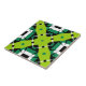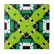 This ceramic tile is a captivating piece of artistry, featuring a vibrant and geometric design. The print is characterized by symmetrical patterns and bold colors that create an intricate and eye-catching pattern. The dominant shapes are lime green, adorned with small black dots and lines that add depth to the design. These shapes form the central focus of the design, drawing the eye with their vivid color and intricate detailing. Contrasting these are dark green squares with white outlines. They provide balance to the lime green elements, anchoring the pattern and giving it a sense of stability. Black lines intersect across the tile, creating additional geometric shapes including triangles and diamonds. These lines add complexity to the design, making it even more engaging. The overall pattern is symmetrical, creating a mirrored effect from the center outwards. This symmetry enhances the visual appeal of the tile, making it a striking addition to any space.