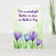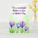 This card features a tall, vertical layout with a soft lime-green background lightly dusted with paler green specks, giving it an airy, springlike feel. The upper two-thirds holds a flowing message in deep violet, centered and spaced to feel calm and affectionate ❤️. The lettering has smooth curves and varying line thickness, like a gentle voice lingering on kind words. Below the text, a cluster of spring flowers rises from the bottom edge, their cupped petals shaded in several purples with one small blue bloom nestled near the middle. Fine dark outlines define each petal and leaf, adding a tender, storybook look without feeling stiff. Slender green stems and pointed leaves lean slightly toward one another, like close friends sharing a quiet moment 🌼. The purple blossoms gather in a loose bouquet at the lower margin, with the single blue flower framed by violet petals and thin green leaves.