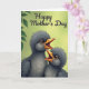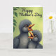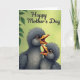 This card features two fluffy baby birds nestled close together near the lower middle, their charcoal-gray feathers softly shaded as they lean toward each other with a trusting, affectionate closeness ❤️. Both birds tilt their heads up with wide orange beaks open, as if calling to a caring parent just out of view, and their large dark eyes add a gentle, needy sweetness. Behind them, a smooth lime-green background fades subtly in tone, giving the scene a fresh springtime feel without distracting from the pair. In the upper left corner, a small cluster of leafy branches frames the space like a quiet shelter, adding a natural setting that feels calm and protective 🌼. Across the top, the words “Happy Mother’s Day” appear in flowing dark cursive lettering, centered and easy to read against the light background. Soft, diffused lighting rounds the birds’ shapes and highlights the fine texture of their down, making their closeness feel tender and intimate. The dark, fuzzy bodies stand out clearly against the bright green backdrop, while the leaves remain a muted green accent in the corner. The upper-left foliage shows layered leaf shapes with gentle shading against the lime-green gradient.