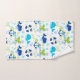 A cute nautical pattern in colors of lime green, navy blue and sky blue is the feature on this three piece bathroom towel set. Images in the pattern include cute whales, life buoys, anchors, and lots of bubbles! Everything is placed on a white background. The bottom of the bath towel is solid matching navy blue, except for a green line border, and your monogram on a white ornate banner lined in green. Kids of all ages will love it!