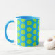 My original digital art on this mug features a pattern of lime green polka dots on an aqua blue background for an artsy style. The inside of the mug and the handle are in an aqua blue tone to complement the artwork. The colors and pattern have a retro vibe for a classic touch.