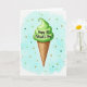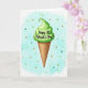 This greeting card features a tasty ice cream cone centered in the scene, topped with a glossy lime-green swirl that looks cool and smooth, like it was just served for St. Patrick’s Day 💚. The creamy folds catch soft highlights, giving the scoop a gentle shine that draws your eye. Written directly across the green soft-serve, the words “Happy St. Patrick’s Day!” appear in a flowing handwritten style, standing out clearly against the frosting-like surface. Below, a golden-brown waffle cone anchors the image, its crisp diamond pattern adding texture and warmth. The background is a pale aquamarine watercolor wash that fades softly toward white around the edges, creating a light, airy setting. Small dots in emerald and light green drift around like confetti, and tiny gold flecks sparkle as if they’re caught mid-celebration ☘️. It’s an easy, friendly design that’s great for sharing St. Patrick’s Day sentiments, with green confetti speckles and shimmering gold accents scattered across the aquamarine wash.
