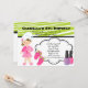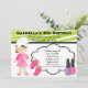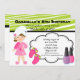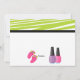 Start your celebration off right with this trendy lime green and white zebra stripe invitation Perfect for that birthday Diva! There's this adorable girl standing in a pink robe with matching slippers. Her hair is wrapped in a towel. There's a white bubble shaped center with a black lined trim and dotted trim. There's two nail polish bottles on the bottom of this invitation. Next to the cute girl is a hot pink pair of flip flops with lime green bows. It's perfect for that girl's birthday party who loves to be pampered! A day at the spa or a party at home. Check out the many other products and designs in this line. © JW Illustrations