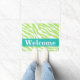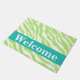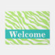Welcome visitors to your home with this stylish and sophisticated lime green and white zebra skin pattern door mat. This door mat is customized with the word Welcome that you can change to another word or name. A turquoise teal blue strip gives an area for personalization and an additional pop of color. Enjoy this popular and contemporary design that will add a trendy home decorative accent. This design is available in several color combinations in this store.